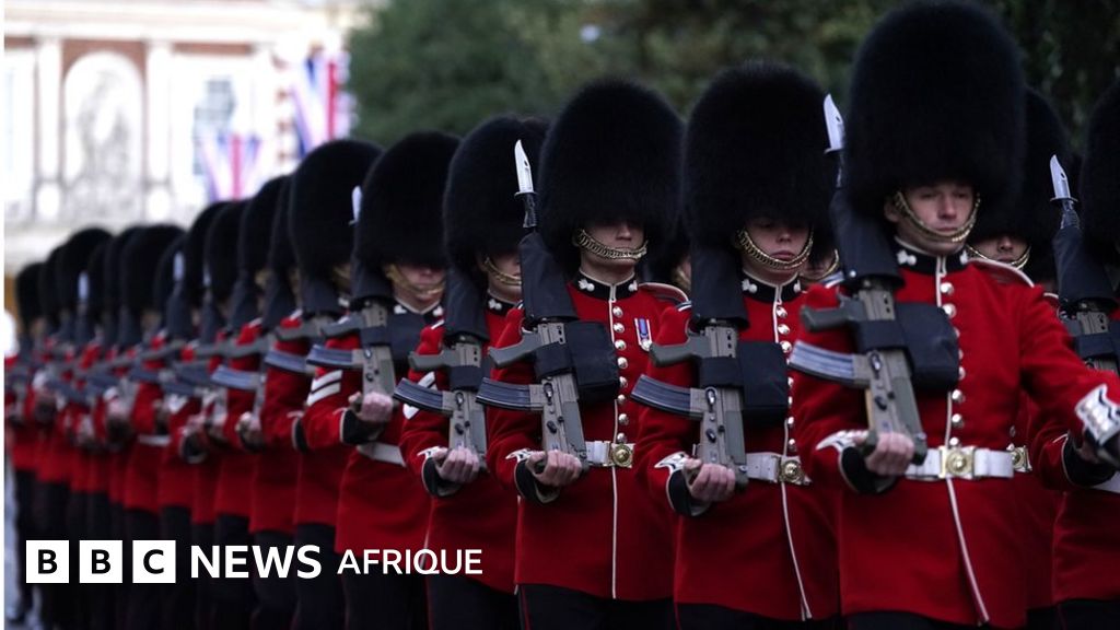 Légende image, Les Grenadier Guards répètent à Windsor pour l'arrivée du cercueil de la Reine, lundi.