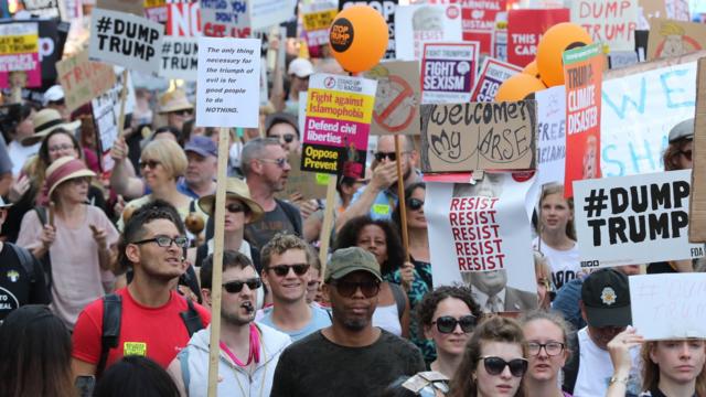 إليكم بعضا من التعليقات على لافتات يرفعها متظاهرون ومتظاهرات ضد ترامب خارج مقر بي بي سي بوسط لندن: