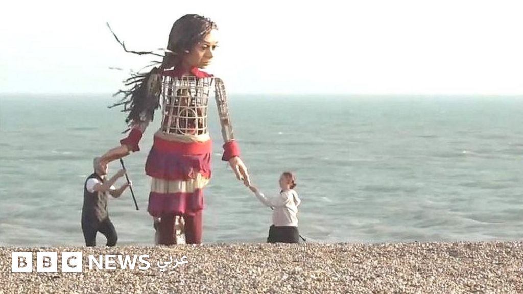 وصلت الدمية "أمل الصغيرة" التي يبلغ ارتفاعها 3.5 متر إلى شواطئ المملكة المتحدة.