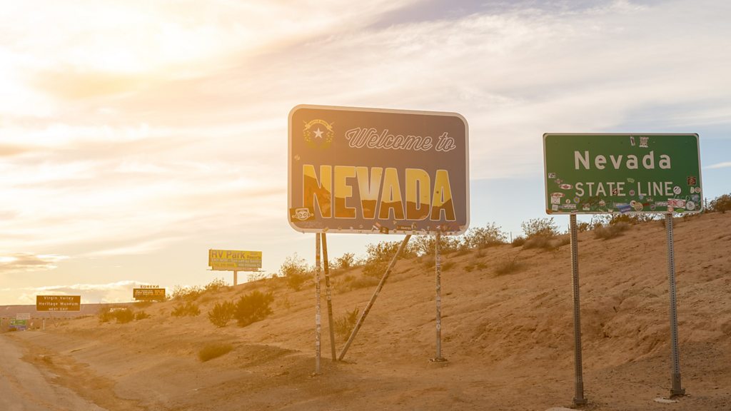 (Picture: A 'Welcome to Nevada' road sign next to a Nevada State boundary sign. Credit: Getty Images)