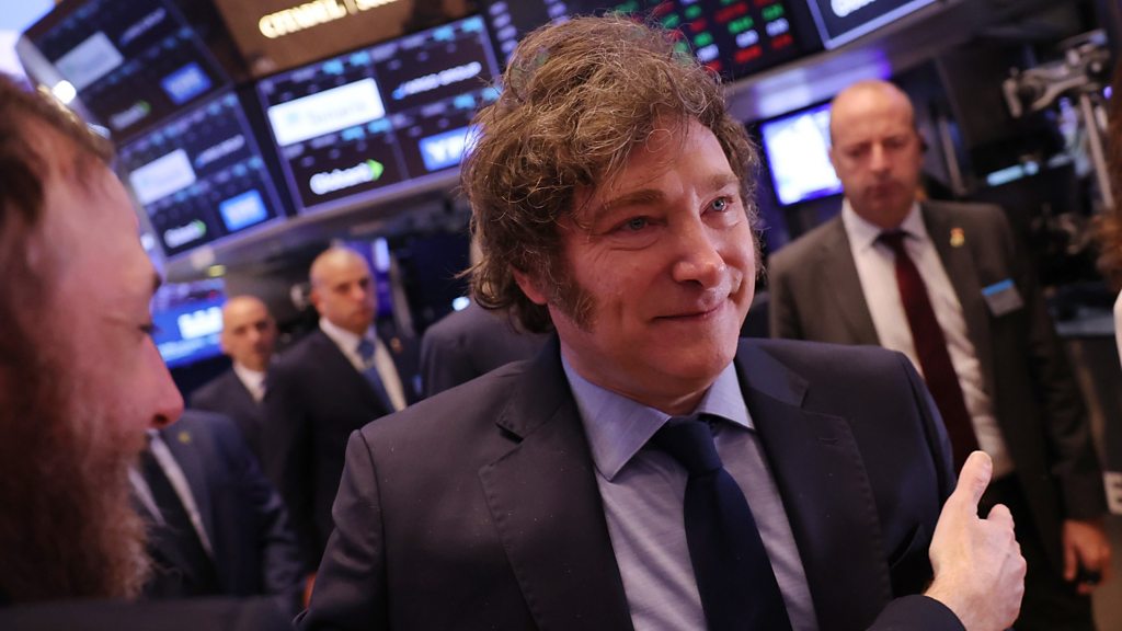 (Picture: Argentina's president, Javier Milei, on the floor of the New York Stock Exchange. Credit: Getty Images)