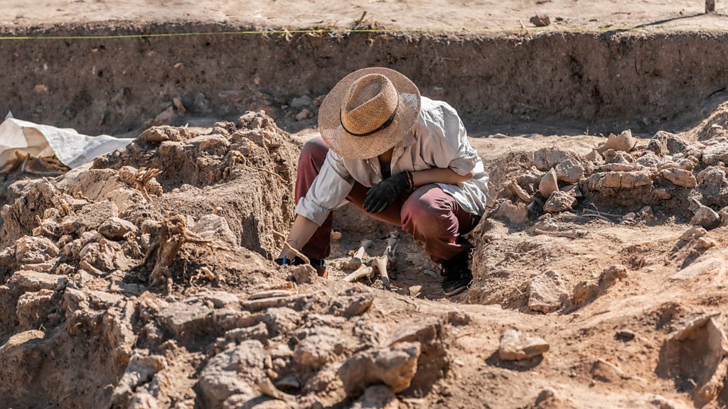 (Picture: Archaeologist excavating part of human skeleton and skull from the ground. Credit: Getty Images.)
