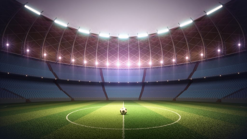 (Picture: Empty stadium with floodlights shining down on a football on the pitch. Credit: Getty Images)