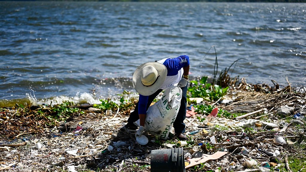 (Image: A worker picks up rubbish on the shore of Lake Amatilan, Guatemala, during a voluntary clean up day in August 2024. Credit: Getty Images)