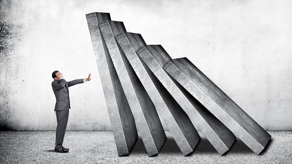 (Photo: A businessman covers his eyes and extends his arm to prevent a series of heavy walls from falling on him. Credit: Getty Images)