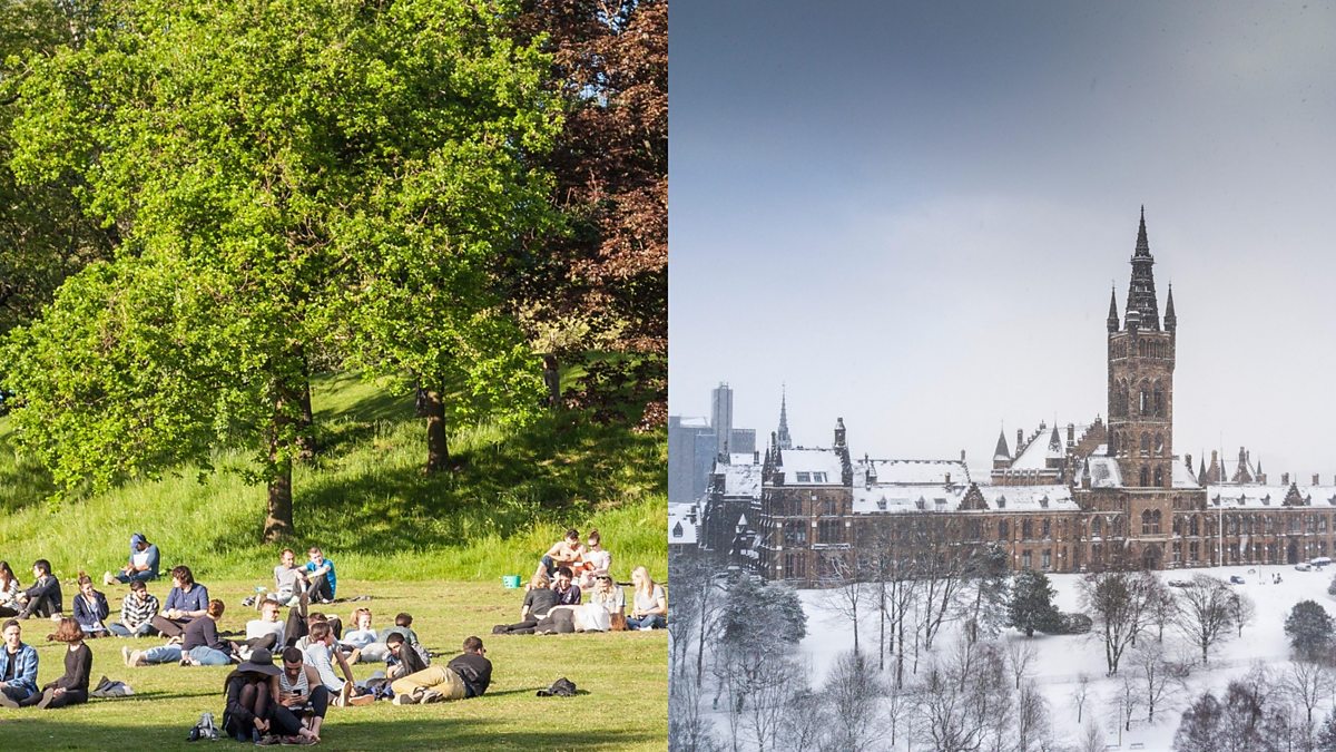 Places near the coast tend to be cooler in summer and milder in winter. Glasgow is near the coast so it doesn't usually get extreme temperatures in summer (left) or winter (right). Although people who live in or near Glasgow might disagree! (Elizabeth Leyden / Chris James / Alamy Stock Photo)