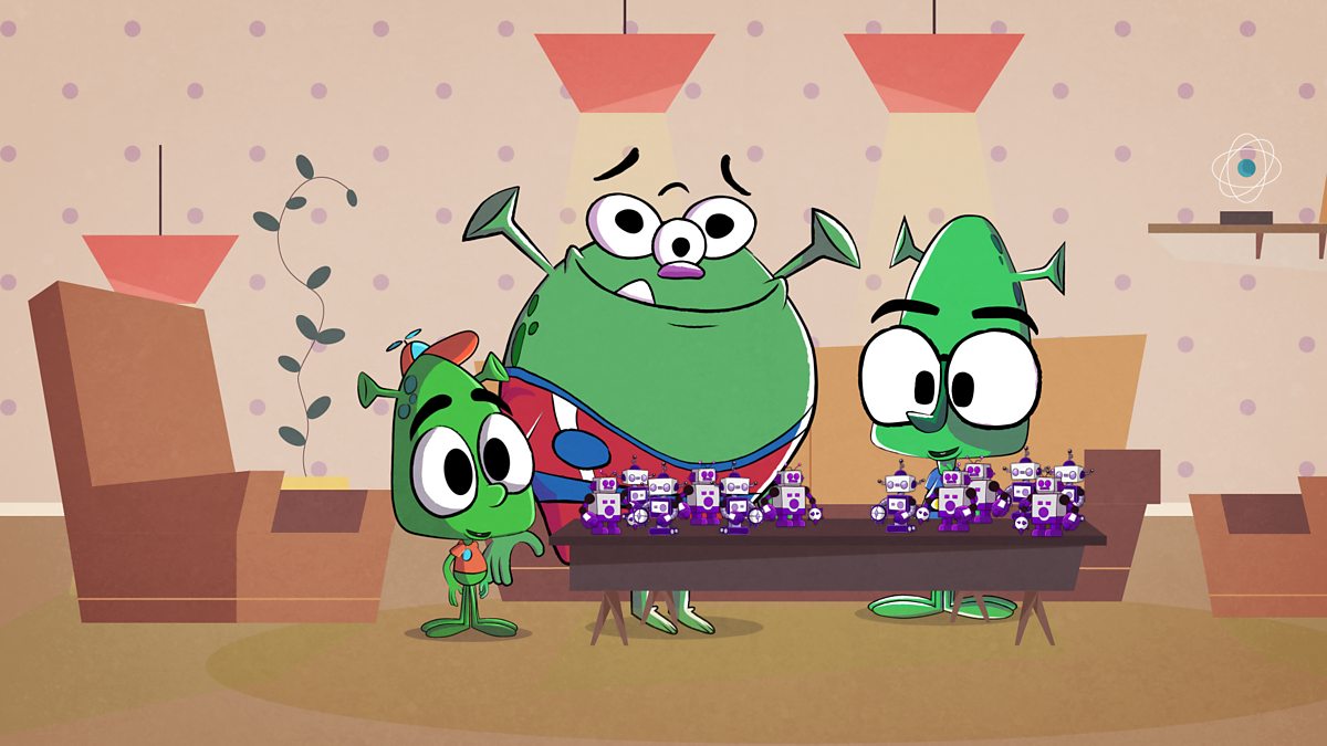Anns a' bhidio tha Fin, Snoot agus Plimble a' feuchainn diofar dhòighean air na ròbotan aca a roinn eatarra.