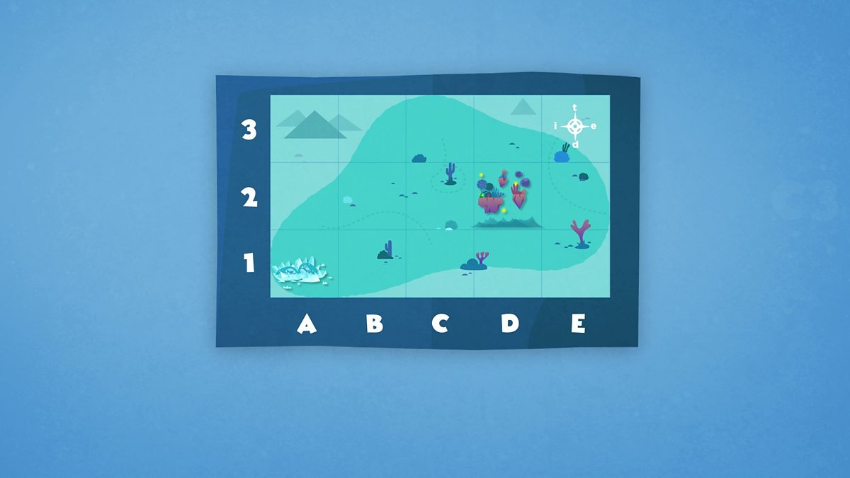 Tha Fin agus Snoot a' cleachdadh nan comharran-clèithe air map airson a dhol cuairt air eilean