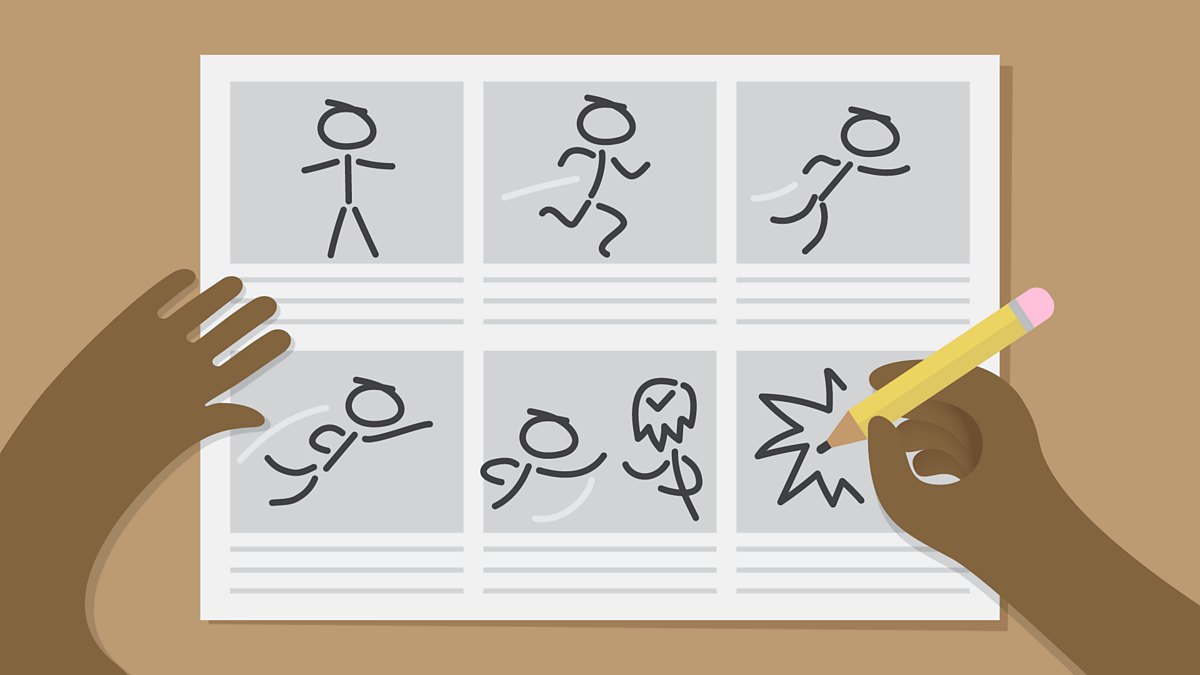 You can use a storyboardA series of scenes laid out in a grid used to plan and show the progress of a story or film. to sketch out your ideas. A storyboard looks a bit like a cartoon strip, and it can help you plan the scene and types of shots you want to record.