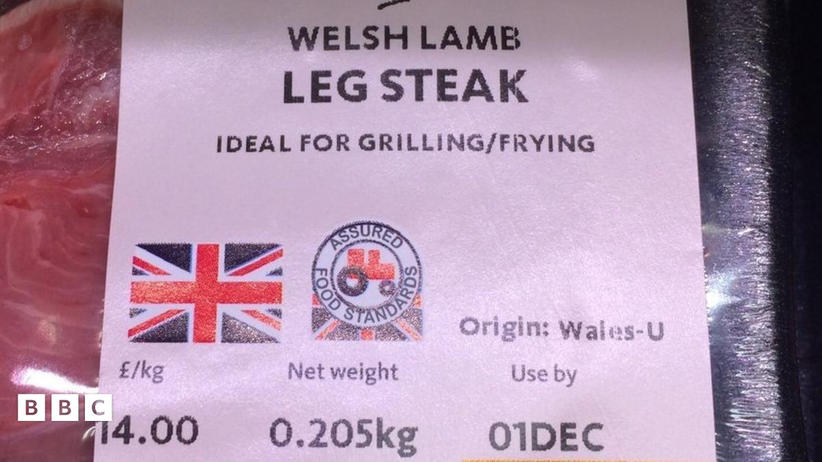 Rhannodd un cwsmer - y ffotograffydd Emyr Young - lun o becyn cig oen Cymreig wedi ei frandio gyda baner Jac yr Undeb mewn archfarchnad yn Hwlffordd.