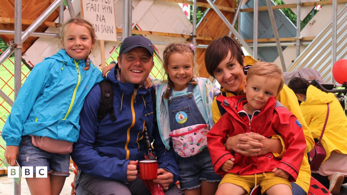 Daniel a Medi o Gaerdydd gyda'u plant Sara, Martha a Gwion