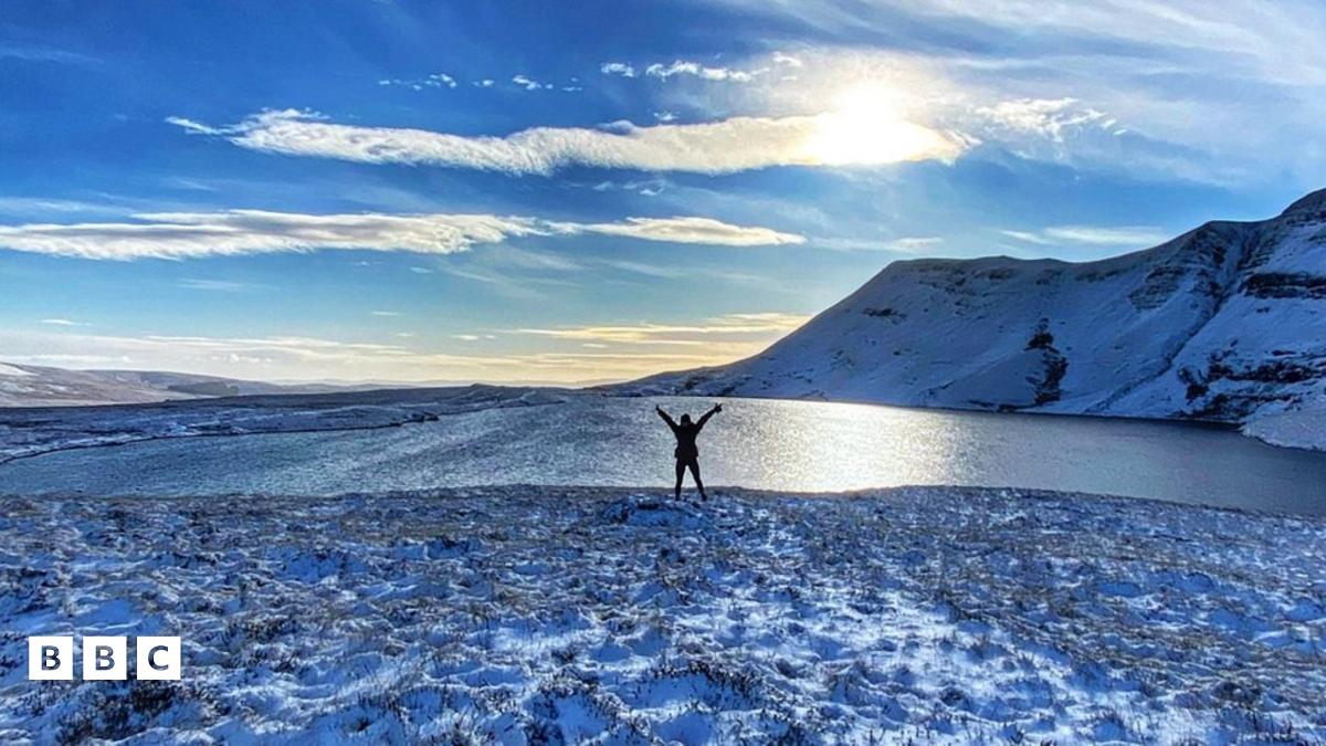 Llyn y Fan Fawr, sydd ar droed Fan Brycheiniog, mynydd uchaf cadwyn y Mynydd Du. Meddai Carly Davies: "Ar ôl deg diwrnod o law, roedd cerdded yn yr eira dan awyr las yn fendigedig."