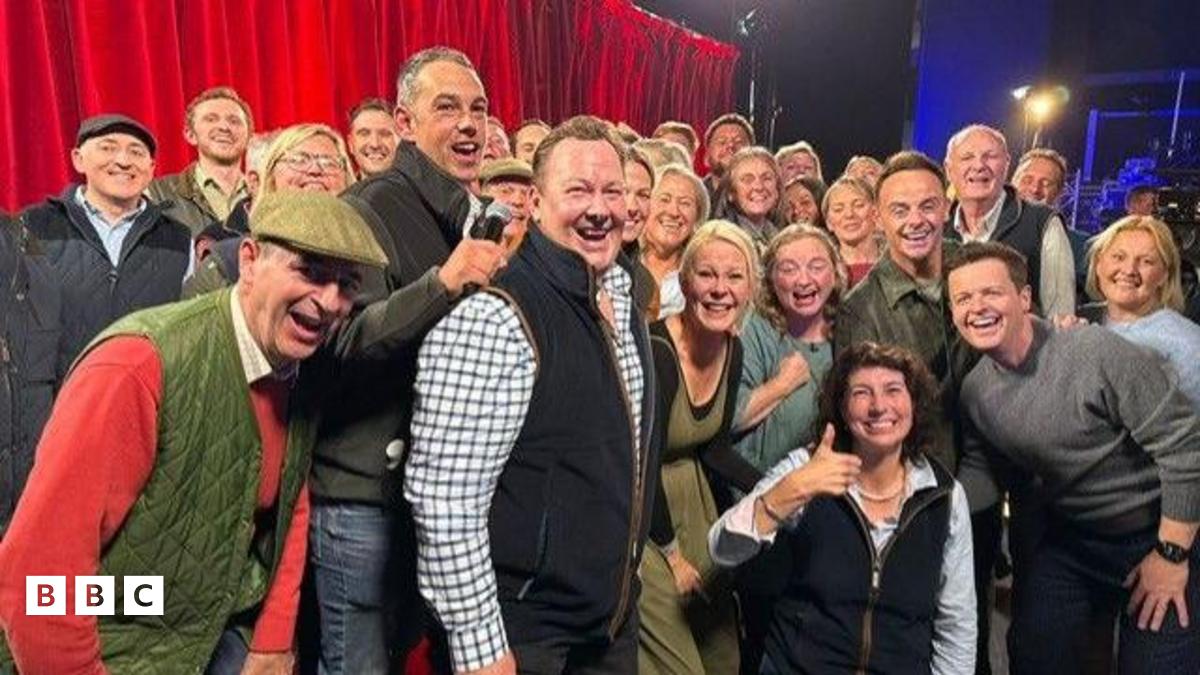Aled Wyn Davies (canol yn y crys siec) ac Aled Griffiths (ar y chwith yn y rhes gefn) gefn llwyfan gyda gweddill aelodau'r Hawkstone Farmers, a chyflwynwyr BGT Ant & Dec (ar y dde)