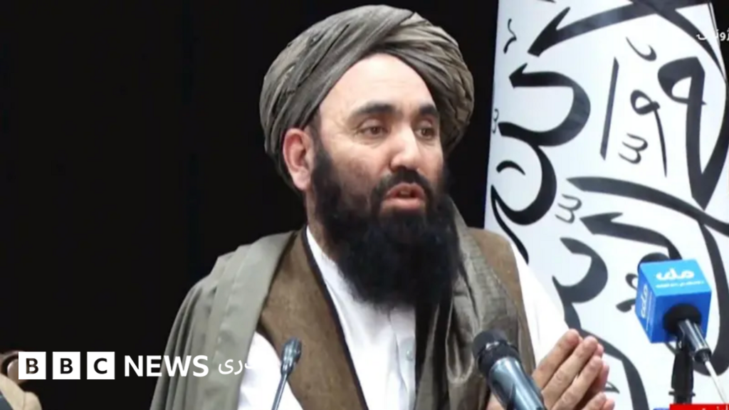 توضیح تصویر، ذبیح‌الله مجاهد سخنگوی حکومت طالبان، پاکستان را مسئول شکست مذاکرات استانبول خوانده است