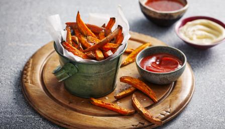 Preheat the air fryer to 200C. Cut the sweet potatoes into 1cm/½in thick chips: try to cut evenly to ensure even cooking and crispness, and keep in mind that shorter chips are easier to fit into the air fryer.