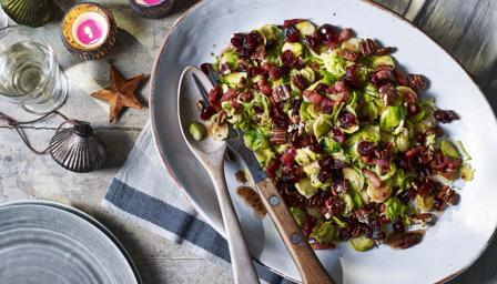 5. To assemble the salad, arrange the leaves in a bowl or serving platter. Add the Brussels sprouts and most of the dressing and toss gently. Sprinkle over the bacon, pecans and cranberries and serve.