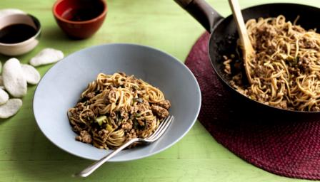 Stir well to break up all the pieces and continue to stir-fry for about 2 minutes, or more, until the pork loses its pink colour. Add the remaining ingredients, except the noodles, stirring all the time. Bring the mixture to the boil, turn the heat down to low and simmer for 5 minutes, adding a little water if it looks too dry.