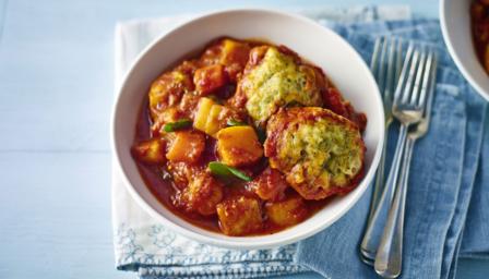 This slow-cooker vegetarian stew with fluffy dumplings is a cheap and easy recipe. To make it vegan, use vegetable suet in the dumplings instead of butter and omit the pesto. This dish is perfect for batch cooking, just divide it up into indiviudal portions and you will always have warming stew at your fingertips, check the tips section for freezing instructions.