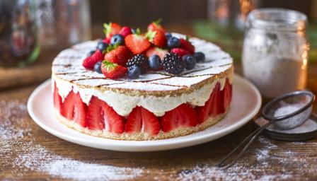 Pile the remaining strawberries and berries on top of the cake. Garnish with sprigs of mint and the caramel curls. Serve cut into wedges with pouring cream if desired.