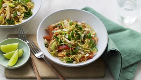 Add the remaining oil to the wok and fry the garlic, ginger and chilli for 20 seconds over a medium heat. Add the vegetables and stir-fry until they are just tender but retain some bite. Add the pre-cooked noodles and sauté for a minute or so before returning the chicken to the pan.