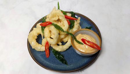 7. Garnish with the curry leaves and chillies. Serve immediately with the salted egg mayonnaise on the side for dipping.