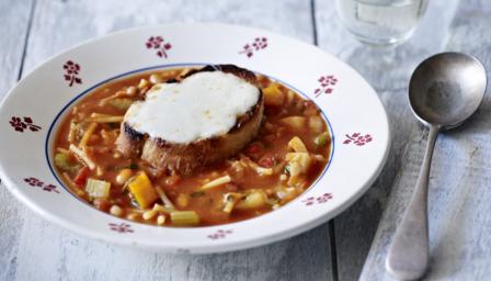 The minestrone soup that kids will actually eat - use whatever veg you've got around and a bit of pasta. This version has a tiny pizza on top!