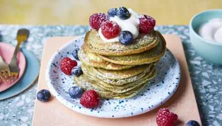 Matcha (green tea powder) adds colour and flavour to these easy vegan pancakes – delicious and stacked high with coconut yoghurt and berries.