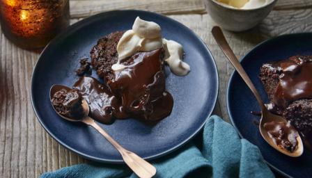 4. Cook on low for 2¼ hours, then remove the lid and tea towel for 15–20 minutes, cooking until the sauce is bubbling around the sides and the top of the sponge is firm. Serve immediately. Alternatively, if preferred, leave the pudding to cool before serving, as the gooey centre will set like a brownie.