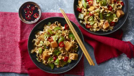 Parts of this tofu chow mein represent good luck and fortune – noodles for longevity and the golden tofu cubes for ingots of gold. A delicious vegan stir fry for Chinese New Year.