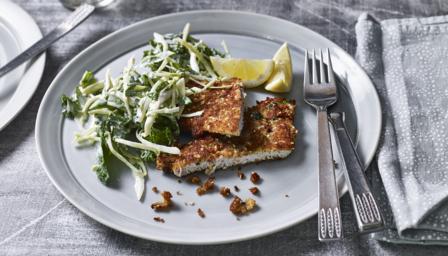 White cabbage, kale, spinach and parsley ring the changes in this green slaw accompanying breadcrumbed turkey escalopes.