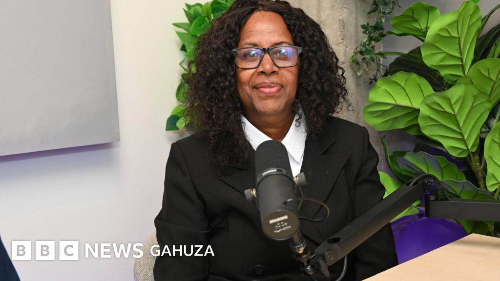 Umunyamakuru wa BBC ari kumwe n'abatumirwa be bo mu kiganiro, bifotoje bahagaze inyuma hari urukuta, ku ruhande hari ururabo rw'icyatsi kibisi.