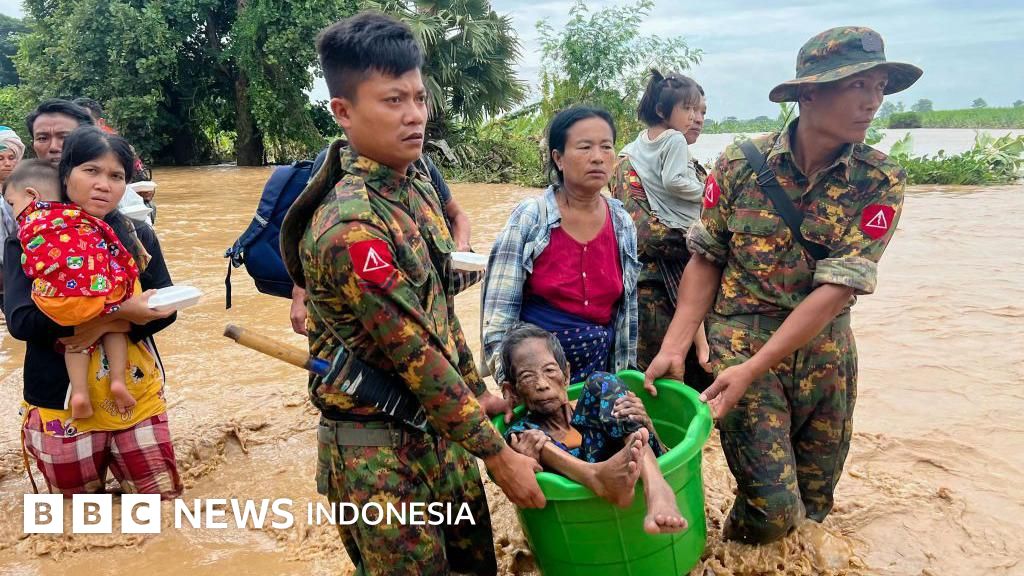 Keterangan gambar, Para korban banjir dibantu oleh personel militer di wilayah Naypyidaw, Myanmar, pada 13 September 2024. Topan Yagi membawa hujan lebat yang menggenangi sebagian besar wilayah Vietnam utara, Laos, Thailand, dan Myanmar, sehingga memicu tanah longsor yang mematikan dan banjir sungai.