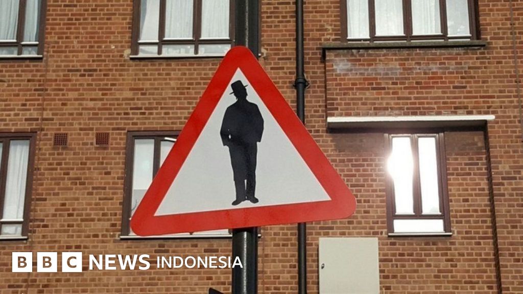 Rambu tersebut bergambar siluet seorang pria Yahudi ortodoks yang mengenakan topi tradisional Fedora dan terpasang pada sebuah tiang lampu di Stamford Hill pada Selasa (14/3).