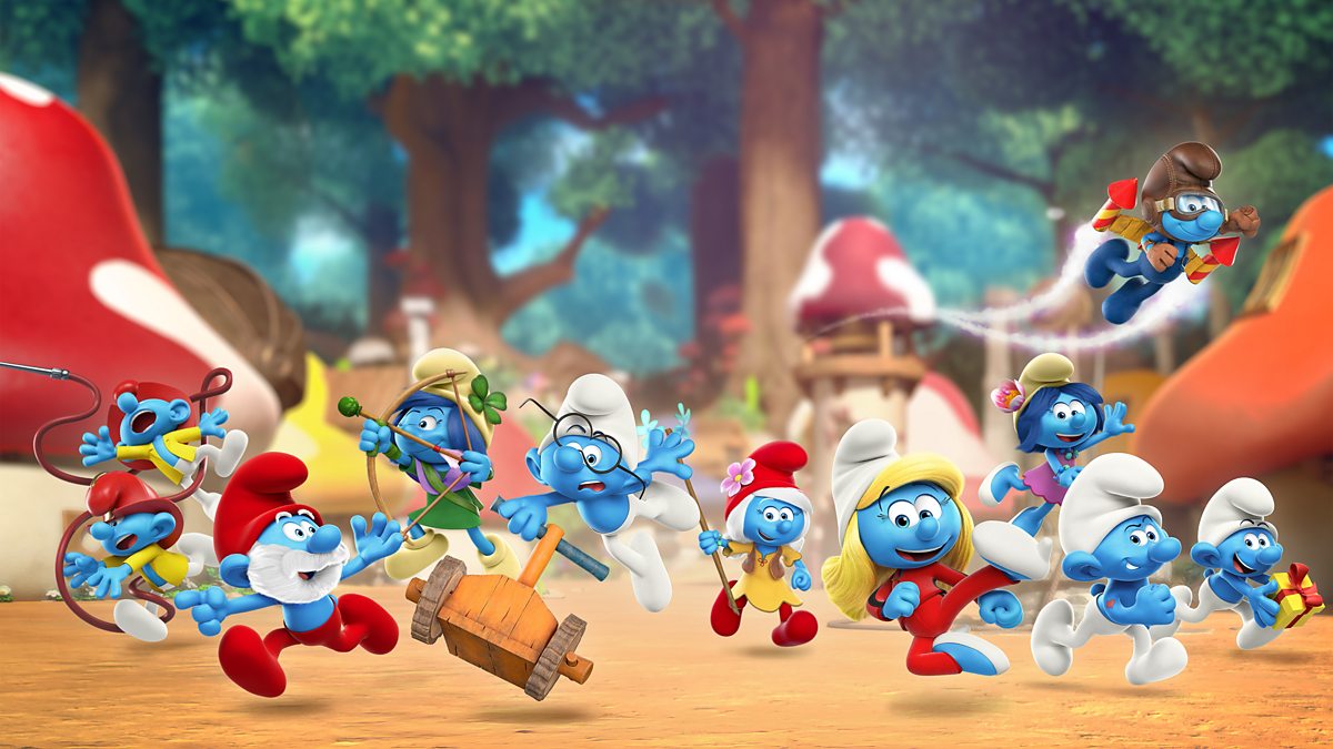 Cartwn eiconig am anturiaethau nifer o gymeriadau bach glas sy'n byw yn y goedwig. Iconic cartoon about the adventures of a crew of little blue characters who live in the forest.
