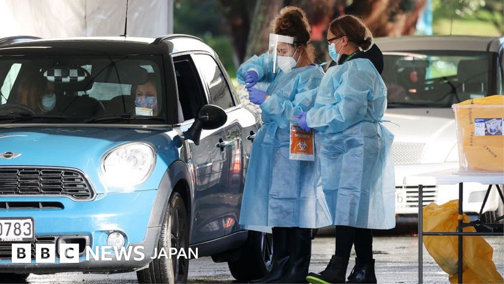 画像説明, ニュージーランド・オークランドの駐車場で検査を受ける人たち。同国は感染者の増加で困難な状況に直面している