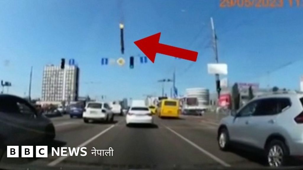 युक्रेनको राजधानी किएभमा गाडीको अगाडिको भागमा रहेको क्यामरा 'ड्याशक्याम' ले खिचेको यो दृश्यमा एउटा व्यस्त सडकमा रुसी क्षेप्यास्त्र खसेको देखिन्छ।