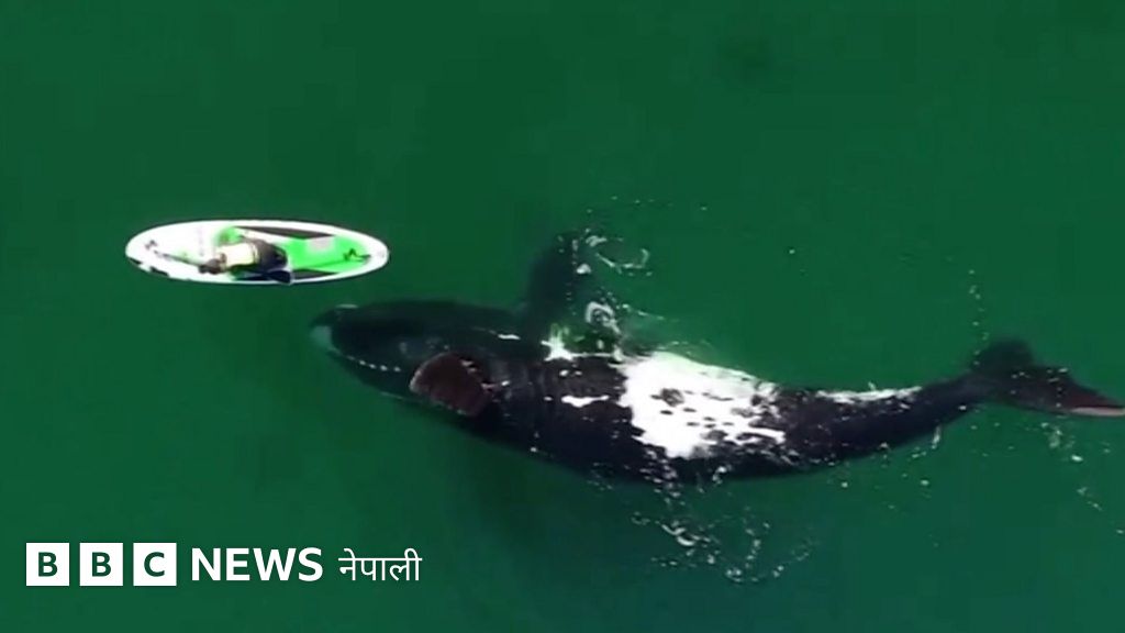 आर्जेन्टिनामा नौकाविहार गरिरहेकी एक युवतीको दुईवटा ह्वेलसँग भएको अनौठो जम्काभेटको दृश्य एउटा ड्रोनले खिचेको छ।