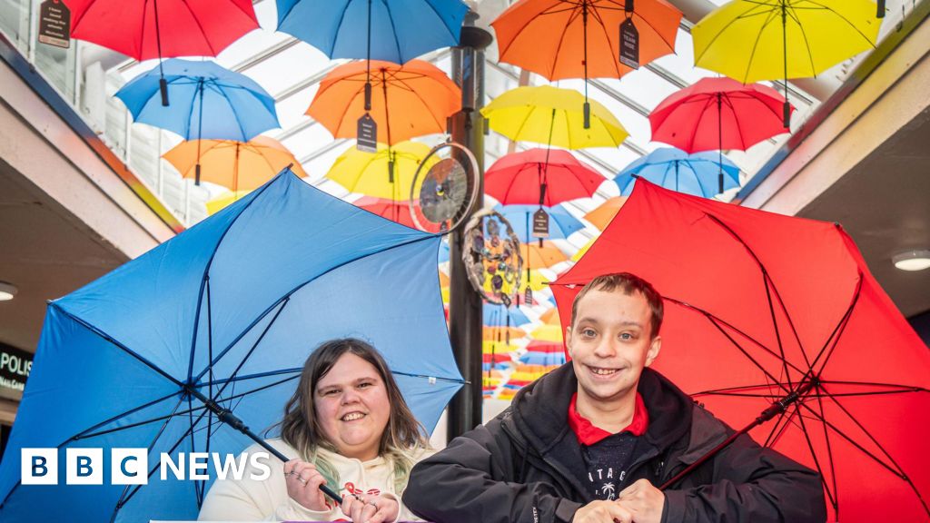 Charter Walk shopping centre in Burnley features a canopy of umbrellas, which hold labels with messages on from people in the community who are neurodivergent.