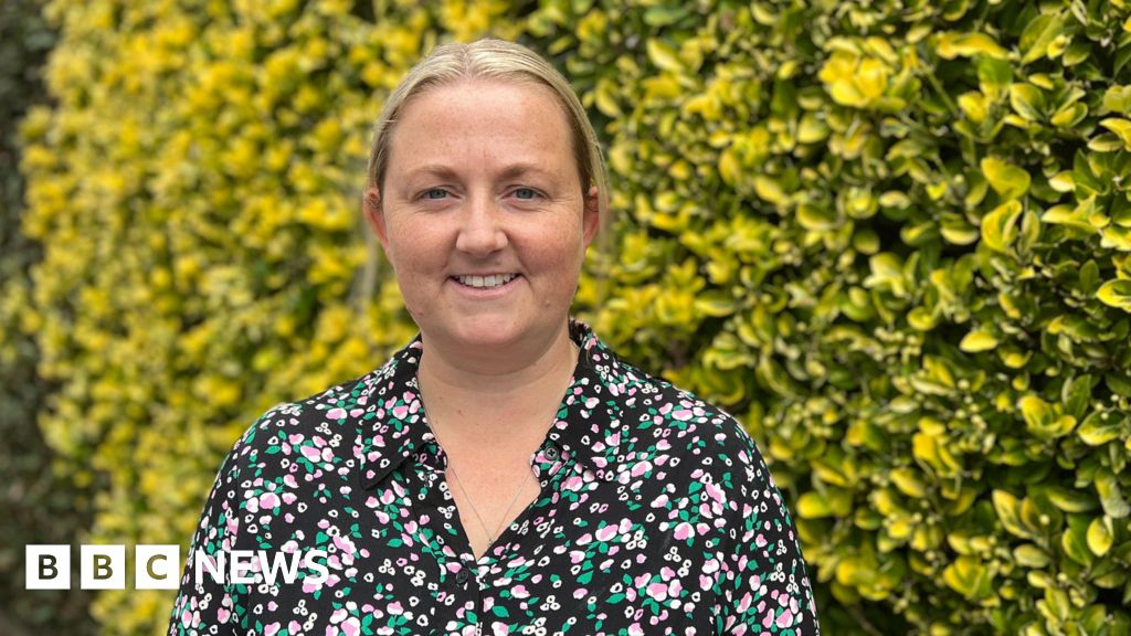 BBC Deputy Lucy Stephenson, who has blonde hair which is tied back, is smiling at the camera while standing in front of a tall hedge with green and yellow foliage. She is wearing a black shirt with a colorful floral pattern. A pathway runs alongside the hedge in the background.BBC
