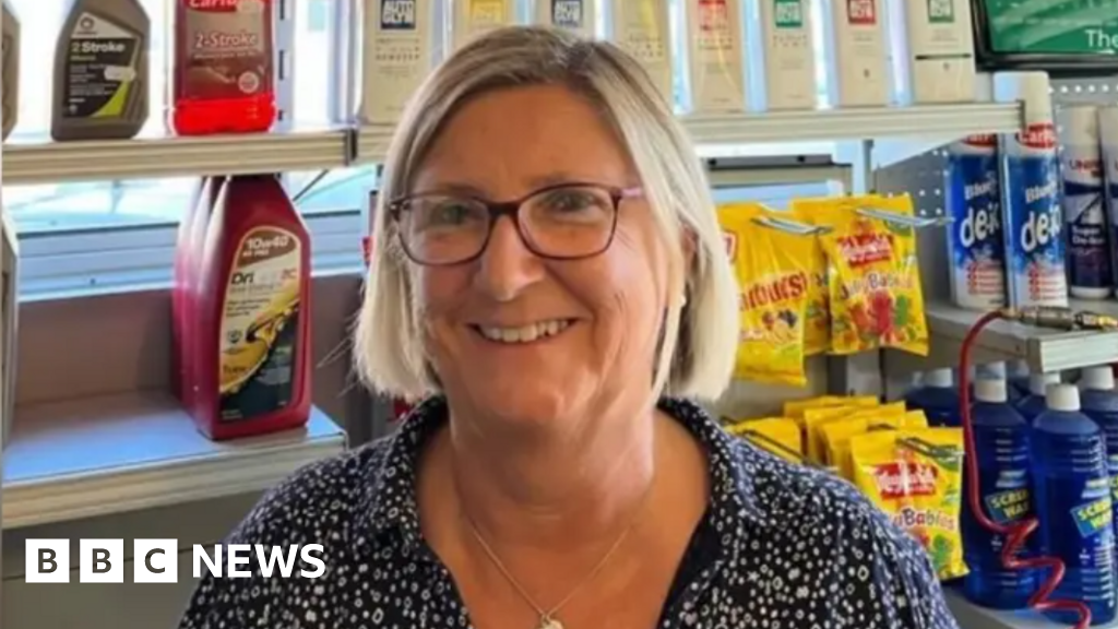 BBC A woman with short blonde hair smiles while wearing purple framed glasses and a blue top with white details. Behind her is various stock from the petrol station including sweets, oil and de-icer BBC