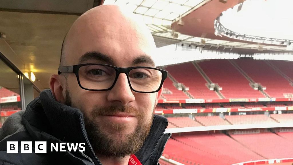 Dervin family Gregory Dervin smiling while on a tour of Arsenal's Emirates Stadium. He has a beard and shaved head and is wearing glasses and a black coat. Behind him are row upon row of empty red seats.Dervin family