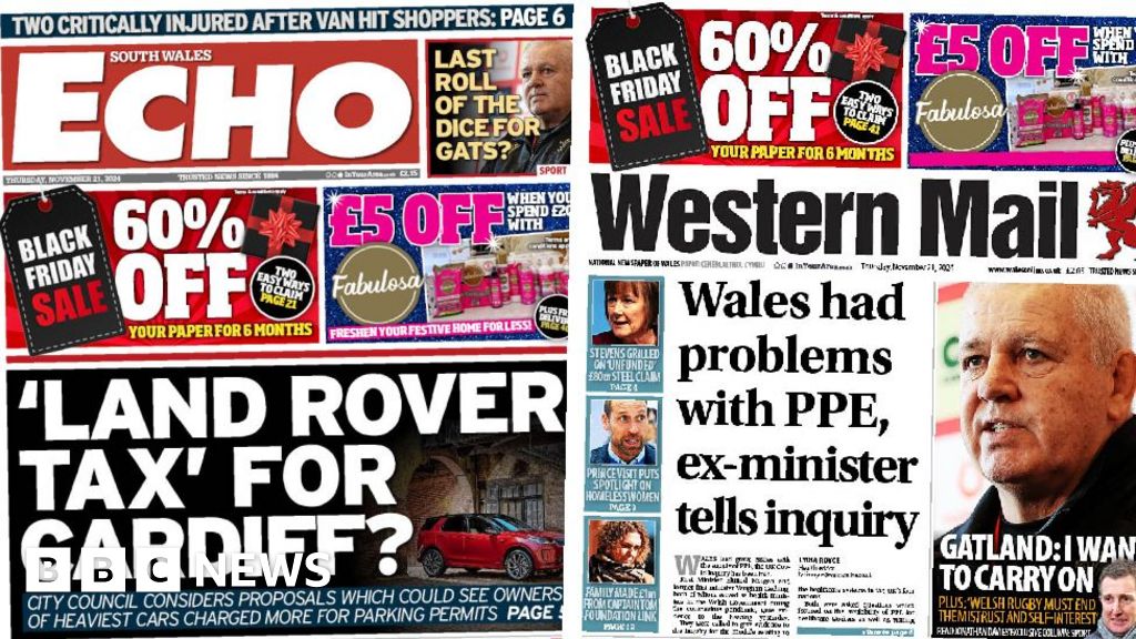 Wales' papers: Land Rover tax plan and PPE problems21 November 2024ShareSaveAdd as preferred on GoogleWestern MailSouth Wales Evening PostSouth Wales EchoTop footballer took thousands of pounds, claim teammates and parentsSanta shortage sees grotto stay shutNHS staff 'may have treated Covid with poor PPE'Wrexham LeaderFlintshire LeaderMore from Wales' papersWestern MailDaily PostSouth Wales Evening PostThe Flintshire LeaderSouth Wales EchoThe Wrexham LeaderSouth Wales ArgusWales