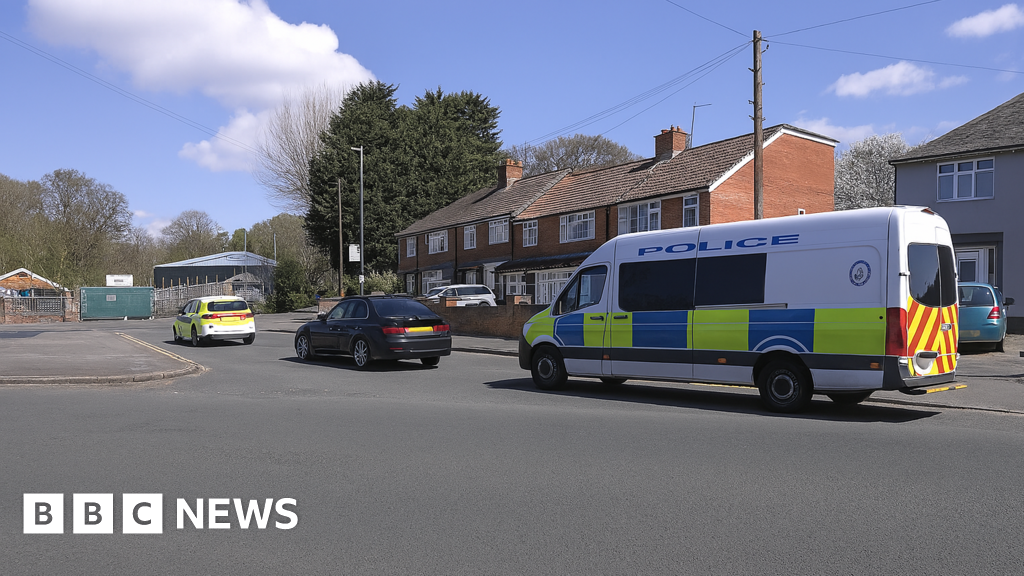 BBC The photo shows a residential street scene with a marked police van and police car parked near terraced houses on a sunny day. Several civilian vehicles are also visible on the road, with trees and buildings in the background.BBC
