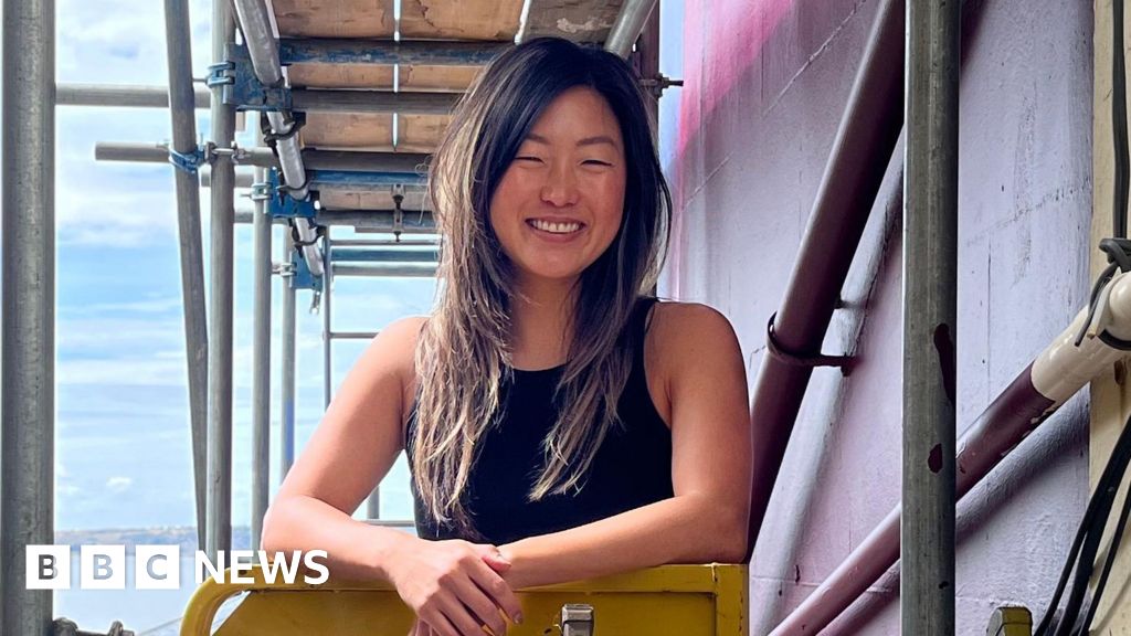 BBC A woman standing on scaffolding smiling. She is stood next to the side of a seafront pub she is painting. Behind her in the distance is the Bristol Channel.BBC
