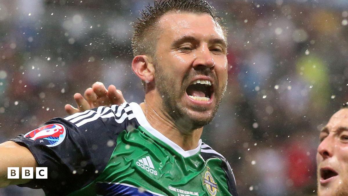 Gareth McAuley celebrates after scoring a goal against Ukraine