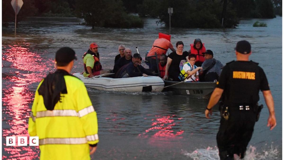 The US city of Houston in Texas has been battered by the biggest storm in its history, which has turned roads into rivers.