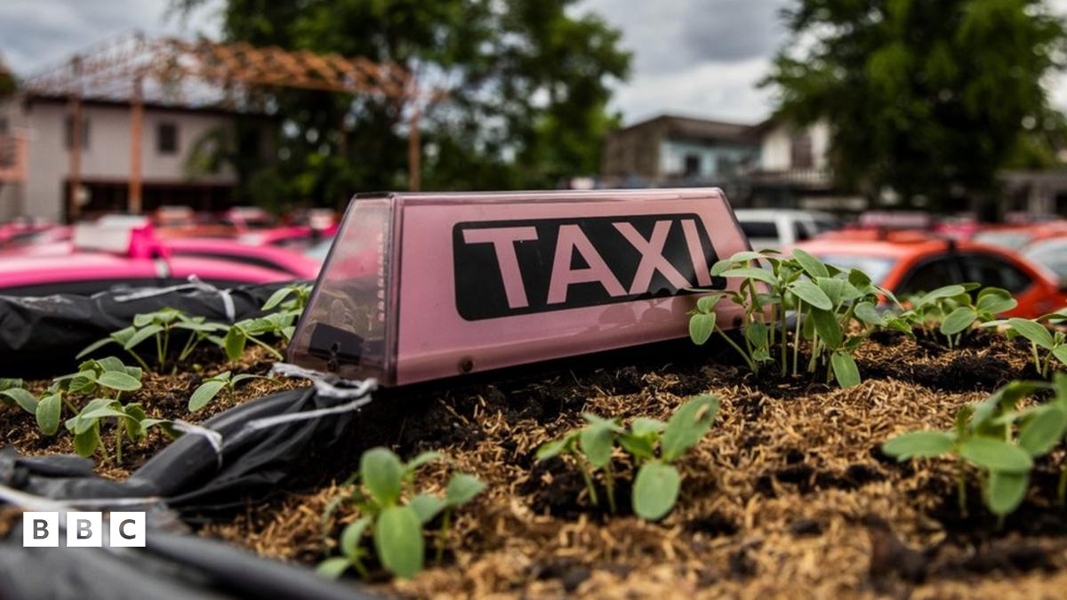 Vegetables are sprouting from the roofs of several taxis parked in the capital city, Bangkok.