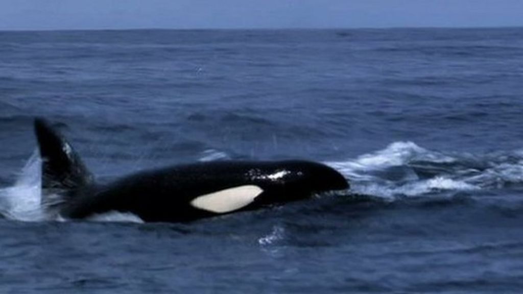 Gray whales migrate north along the west coast of the USA in the spring and although it is known the vulnerable young are often targetted by killer whales, it is rarely captured on film.