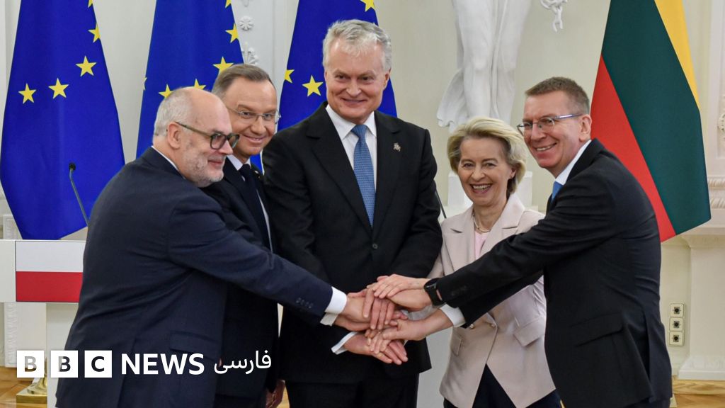 آندژی دودا رئیس‌جمهور لهستان، گیتاناس نائوسدا رئیس‌جمهور لیتوانی، اورسولا فن در لاین رئیس کمیسیون اروپا، آلار کاریس رئیس‌جمهور استونی، و ادگار رینکویچ رئیس‌جمهور لتونی که دست‌های خود را روی هم گذاشته‌اند.