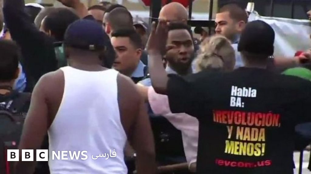 تصاویر تلویزیونی نشان میدهد که معترضان به سوی پلیس اشیایی پرتاب میکردند و یکی از آنها روی کاپوت اتومبیل پلیس بالا و پایین میپرید.